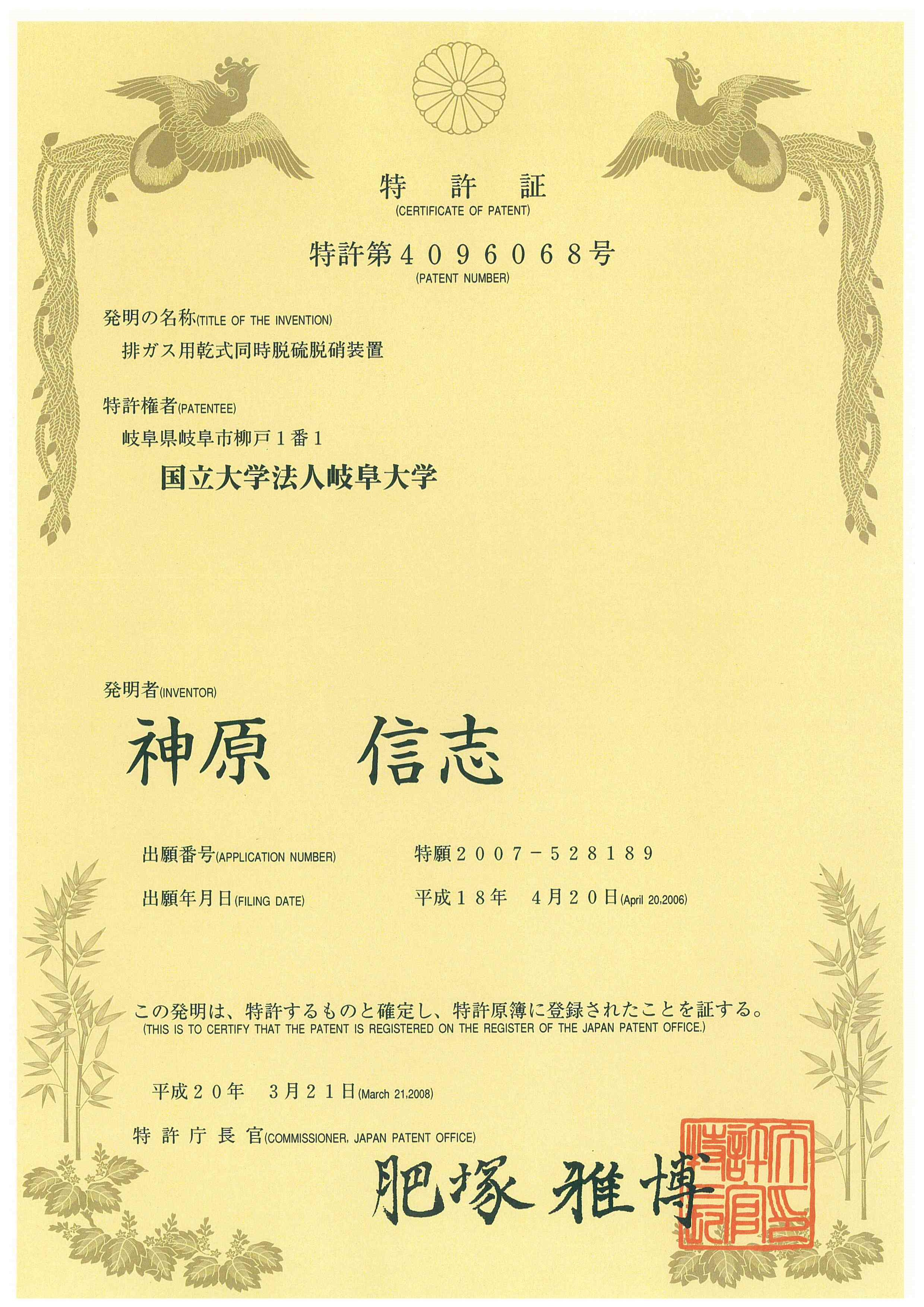 神原信志,特許第4096068号(2008.3.21).